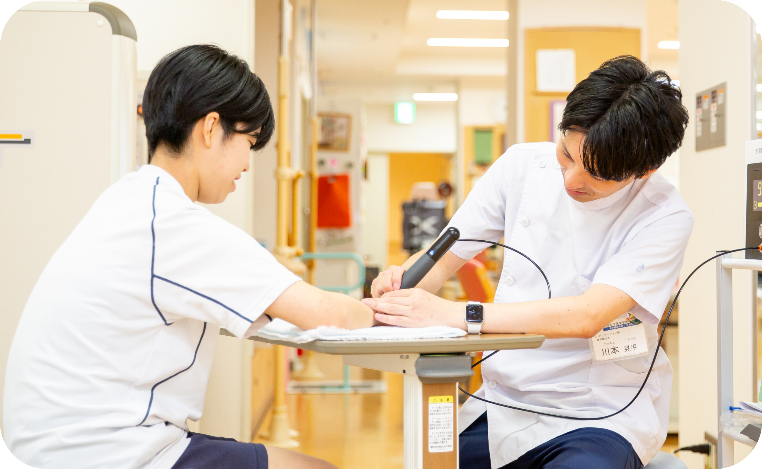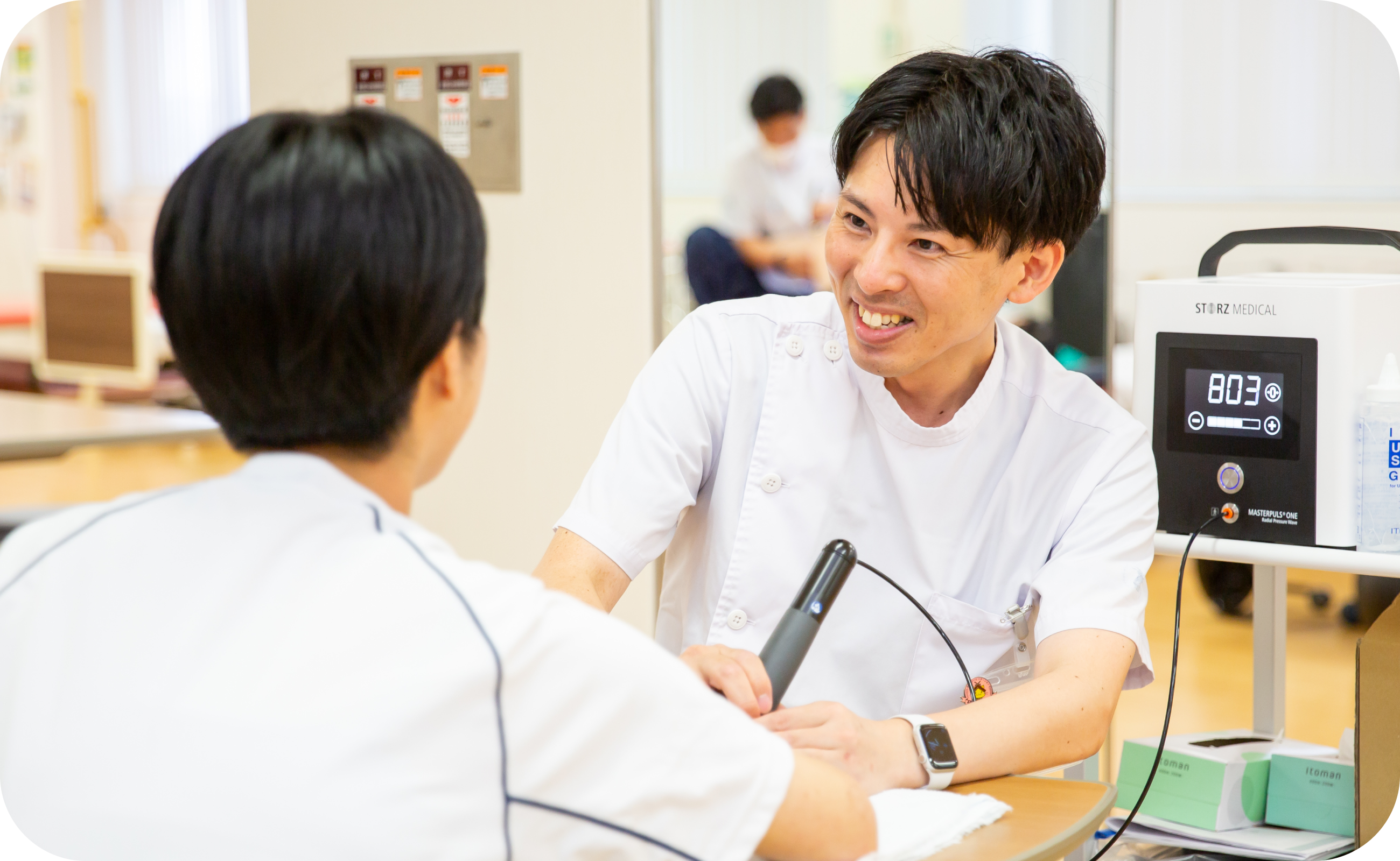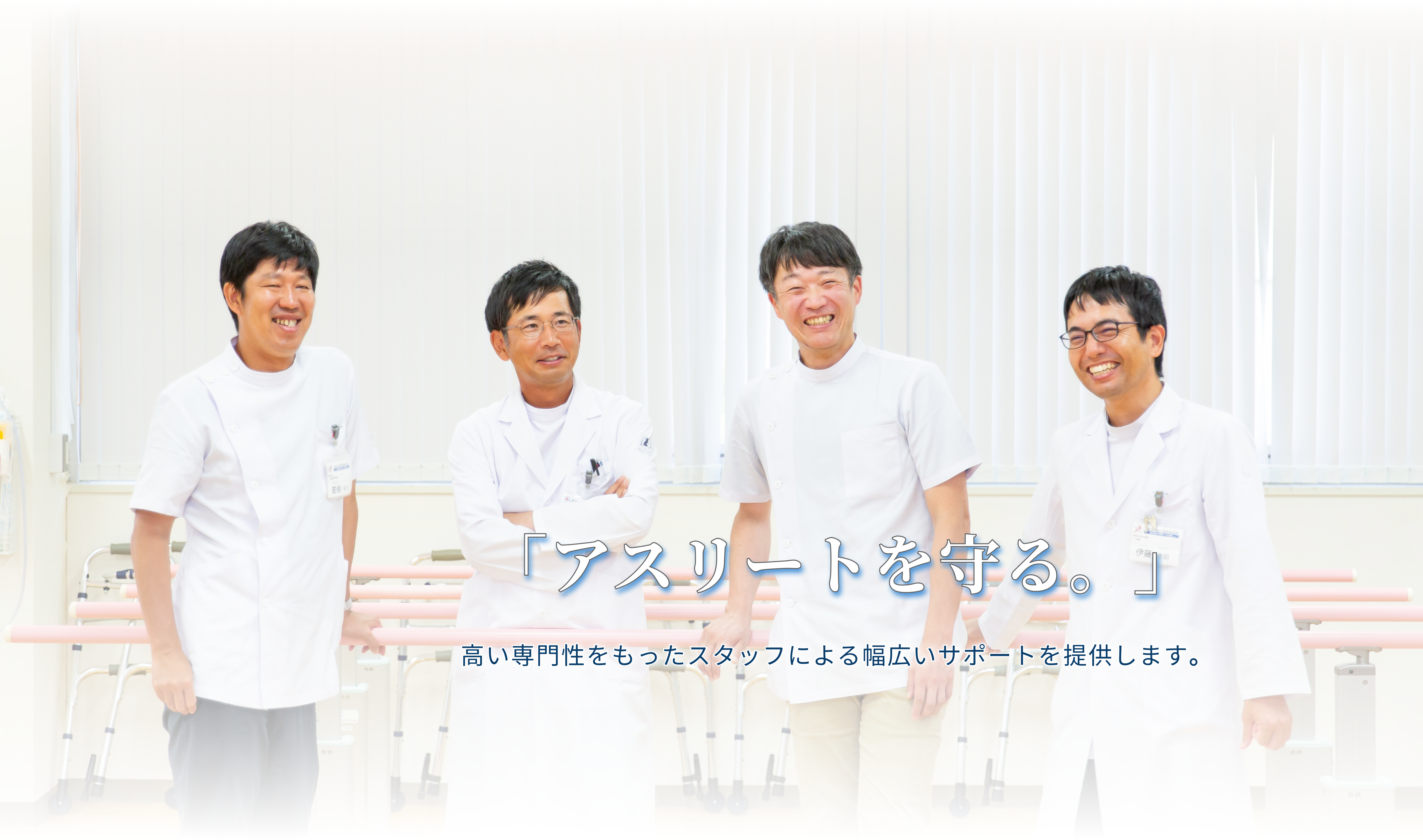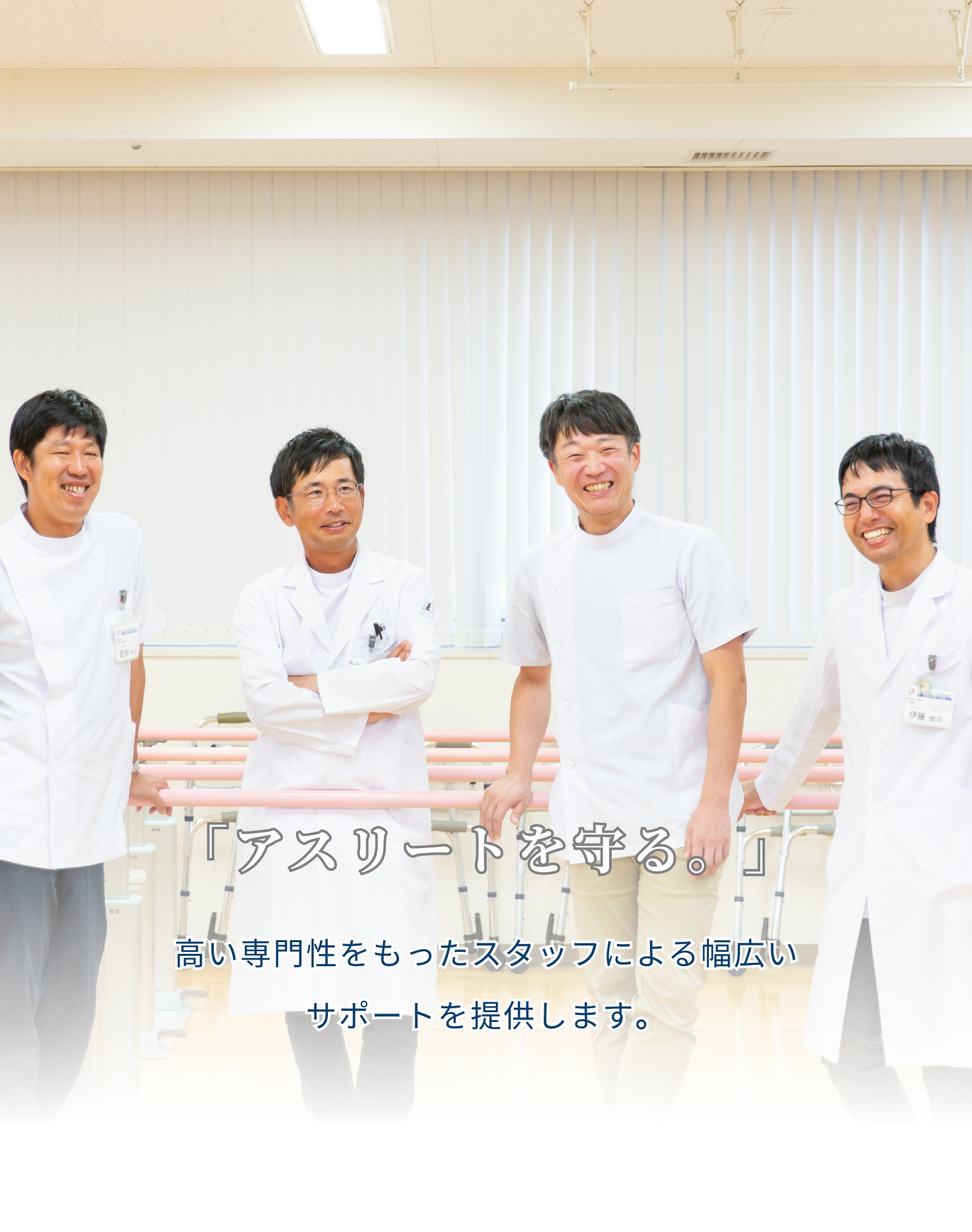 4名のスタッフが診療を担当します。また、当院には日本スポーツ協会認定アスレティックトレーナーが4名在籍しており、患者さんの身体機能の評価に基づいた適切なアスレティックリハビリテーションを提供することが可能です。